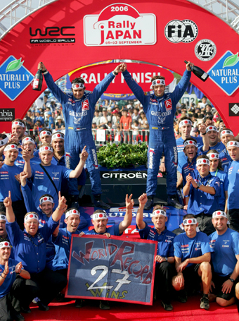 Sebastien Loeb (on the car, R) of France and co-driver Daniel Elena of Monaco