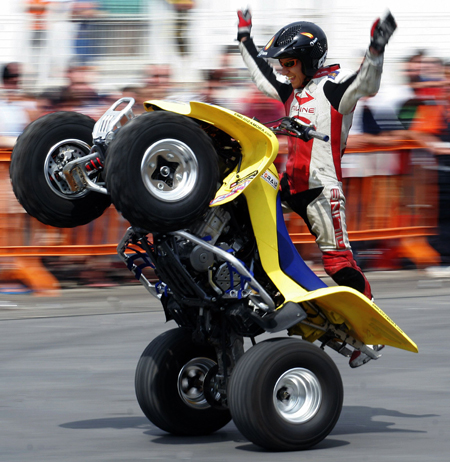 Spanish rider Emilio Zamora performs a wheelie during an acrobatic show in Almeria, southeast Spain September 5, 2006.[Reuters]