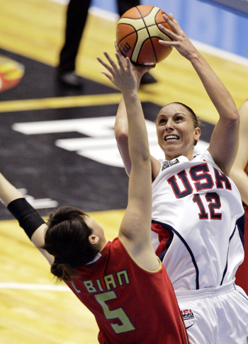 Diana Taurasi (R) of the U.S. attempts to shoot past China's Lan Bian during
