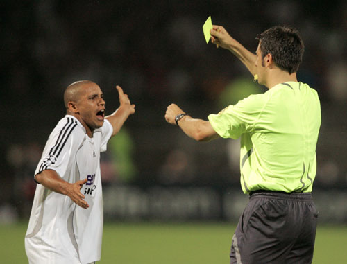 Real Madrid's Roberto Carlos gets a yellow card from referee Wolfgang Stark during a Champions League Group E soccer match against Olympique Lyon at the Gerland stadium in Lyon September 13, 2006.[Reuters]
