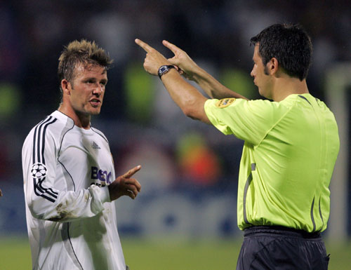 Lyon tame Real Madrid (Reuters) Updated: 2006-09-14 10:15  Real Madrid's David Beckham (L) argues with referee Wolfgang
