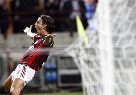 AC Milan's Filippo Inzaghi celebrates after scoring against AEK Athens during