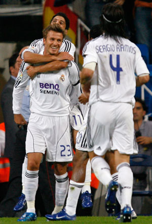 Beckham smiles after win (Reuters) Updated: 2006-09-18 10:42  Real Madrid's David Beckham (23) celebrates his goal against