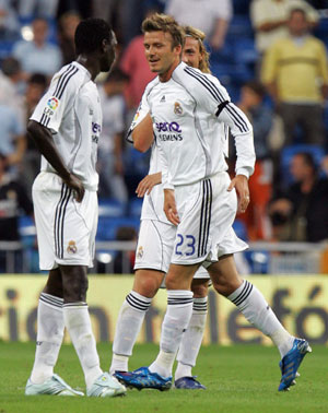 Beckham smiles after win (Reuters) Updated: 2006-09-18 10:42  Real Madrid's David Beckham (C) celebrates his goal against