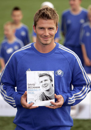his book entitled "Making It Real: My Soccer Skills Book" during a photocall at