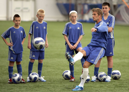 Beckham at soccer academy (Reuters) Updated: 2006-09-19 09:08  Former England captain David Beckham (2nd R) kicks a soccer