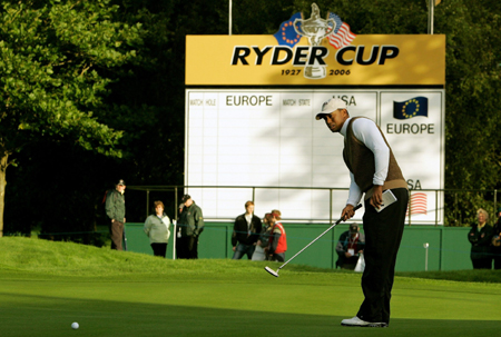 U.S. Ryder Cup player Tiger Woods hits a putt on the fourth green during a golf practice for the Ryder Cup in County Kildare, Ireland, September 19, 2006. [Reuters]
