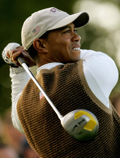 U.S. Ryder Cup player Tiger Woods hits a shot on the fifth hole during a golf practice for the Ryder Cup in County Kildare, Ireland, September 19, 2006.[Reuters]