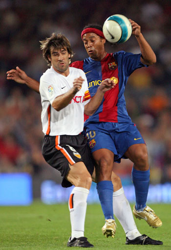 Barcelona's Ronaldinho fights for the ball against Valencia's captain Albelda