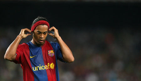 Barcelona's soccer player Ronaldinho reacts during their Spanish First
