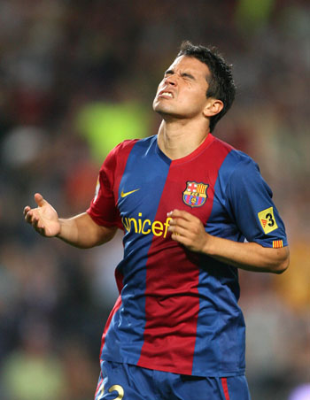 Barcelona's javier Saviola reacts during their Spanish First Division soccer match against Valencia at Nou Camp Stadium in Barcelona, September 24, 2006. [Reuters]