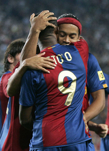 Barcelona's Samuel Eto'o (L) is embraced by teammate Ronaldinho after the