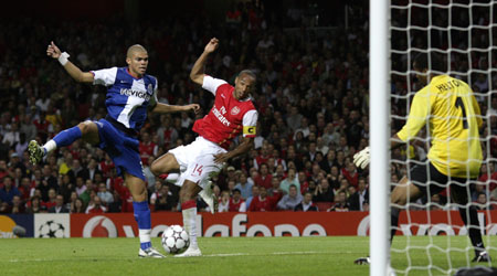 Arsenal's Thierry Henry (C) scores a goal as Porto's Pepe (L) and goalkeeper