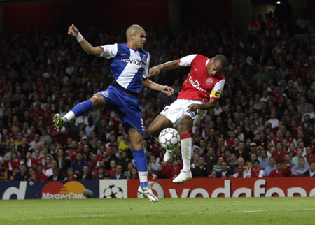 Arsenal's Thierry Henry (R) scores a goal as he is tackled by Porto's Pepe