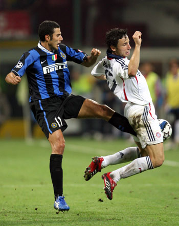 Bayern Munich's Mark van Bommel (R) fights for the ball with Inter Milan