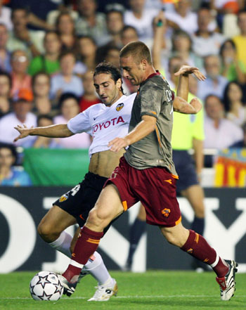 Roma's Daniele De Rossi (R) fights for the ball with Valencia's Emiliano Moretti during their Champions League Group D soccer match in Valencia September 27, 2006. [Reuters]