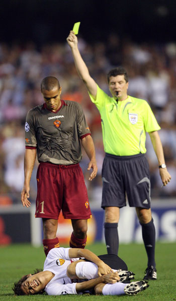 German referee Fandel Herbert (R) shows a yellow card to Roma's Matteo