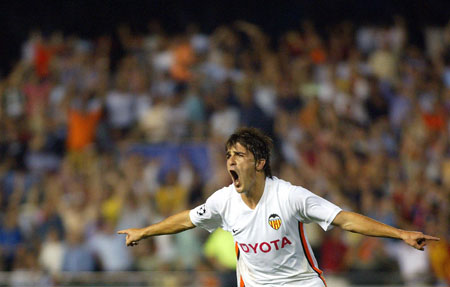Valencia's David Villa celebrates after scoring a goal against Roma during their Champions League Group D soccer match in Valencia September 27, 2006. [Reuters]