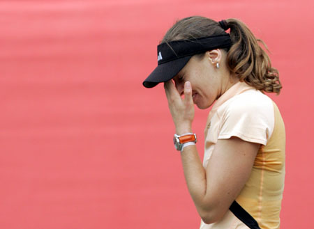 Martina Hingis of Switzerland reacts during her second round match against India's Sania Mirza at the Hansol Korea Open Tennis Championships in Seoul September 28, 2006. [Reuters]