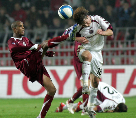Sparta Prague's Ludovic Sylvestre (L) challenges Hearts' Saulius Mikoliunas during their UEFA Cup first round, second leg soccer match in Prague September 28, 2006. [Reuters]