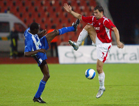 Iraklis' Garba Lawal (L) challenges Wisla Krakow's Radoslaw Sobolewski during their UEFA Cup first round second leg soccer match in Thessaloniki September 28, 2006. [Reuters]