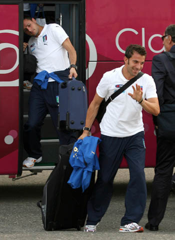 Italy's Alessandro Del Piero (R) and a team mate arrive at a hotel ahead of