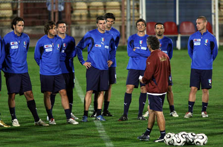 Italy's national soccer team listens to coach Roberto Donadoni (back to camera) during a practice session in Tbilisi October 9, 2006. [Reuters]