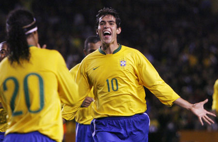 Brazil's Kaka (R) runs towards Ronaldinho (20) after scoring against Ecuador in their international friendly soccer match in Stockholm October 10, 2006. [Reuters]