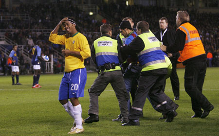 Brazil's Ronaldinho (20) adjusts his headband as security officers remove a