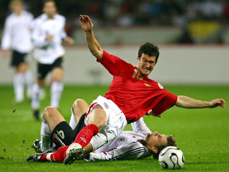 Germany's Markus Brzenska (on ground) fouls England's David Nugent during