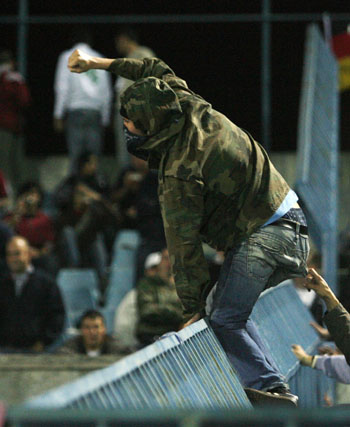 A Germany fan is held back as he tries to climb over a fence during the Euro