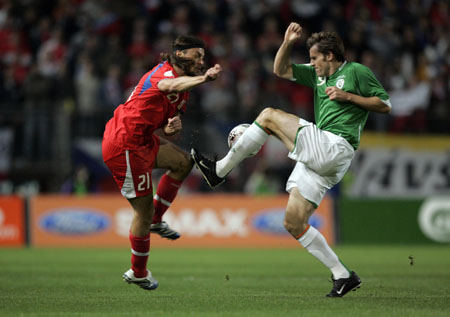 Czech Republic's Tomas Ujfalusi is tackled by the Ireland's Kevin Kilbane during their Euro 2008 Group D qualifying soccer match at Lansdowne Road, Dublin, October 11, 2006. [Reuters]