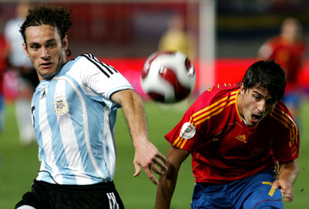 Spain's David Villa (R) and Argentina's Gabriel Milito fight for the ball during their international friendly soccer match at Nueva Condomina stadium in Murcia, Spain October 11, 2006. [Reuters]