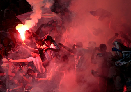 Argentina fans light a flare during their team's friendly soccer match against Spain at Nueva Condomina stadium in Murcia, Spain, October 11, 2006. [Reuters]