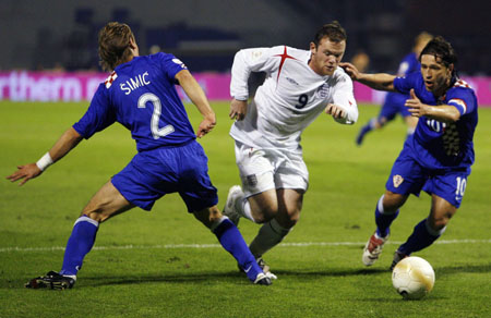 England's Wayne Rooney (C) breaks between Croatia's Dario Simic (L) and Niko