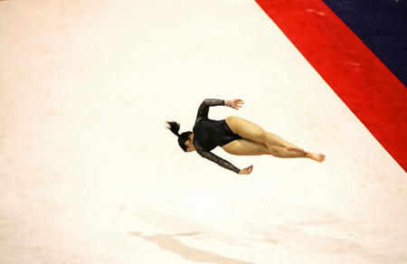 A gymnast performs on the floor during a practice session for the Gymnastics World Championships in Aarhus October 12, 2006. [Reuters]