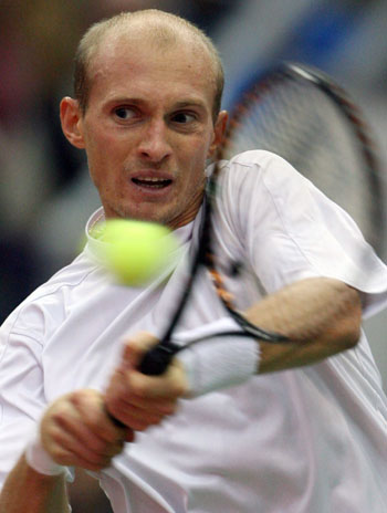 Russia's Nikolay Davydenko returns a shot to compatriot Marat Safin during their final match at the Kremlin Cup tennis tournament in Moscow October 15, 2006. [Reuters]