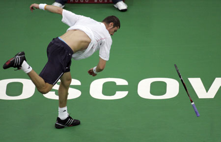 Russia's Marat Safin reacts after losing a point to compatriot Nikolay Davydenko during the final match of the Kremlin Cup tennis tournament in Moscow October 15, 2006. [Reuters]