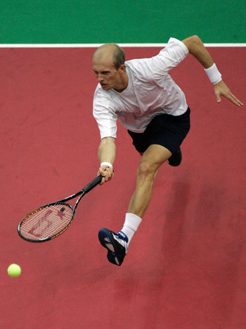 Russia's Nikolay Davydenko returns a shot to compatriot Marat Safin during their final match at the Kremlin Cup tennis tournament in Moscow October 15, 2006. [Reuters]