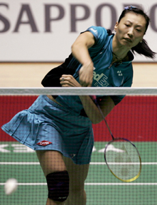 China's Zhang Ning returns the shuttlecock to China's Xie Xinghang during their women's singles final match at the Japan Badminton Open in Tokyo October 15, 2006. [Reuters]