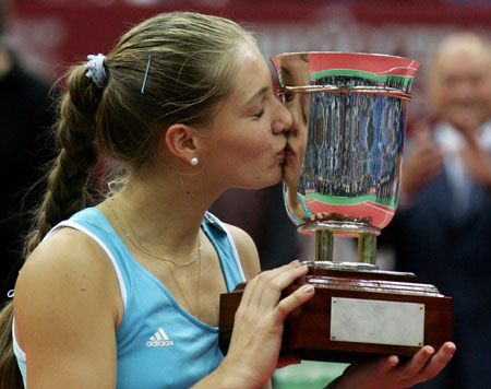 Russia's Anna Chakvetadze kisses her trophy after winning the Kremlin Cup final tennis match against compatriot Nadia Petrova in Moscow October 15, 2006. [Reuters]