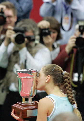 Russia's Anna Chakvetadze kisses her trophy after winning the Kremlin Cup final tennis match against compatriot Nadia Petrova in Moscow October 15, 2006. [Reuters]
