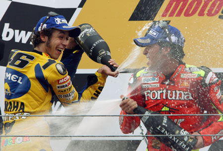 Honda MotoGP rider Toni Elias of Spain (R) and Yamaha's Valentino Rossi of
