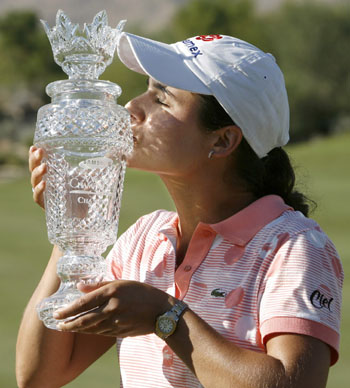 Lorena Ochoa of Mexico kisses her trophy after winning the Samsung World Championship golf tournament in Palm Desert, California, October 15, 2006. [Reuters]