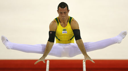 Diego Hypolito from Brazil competes on the parallel bars at the Artistic Gymnastics World Championships in Aarhus, Denmark October 15, 2006. [Reuters]