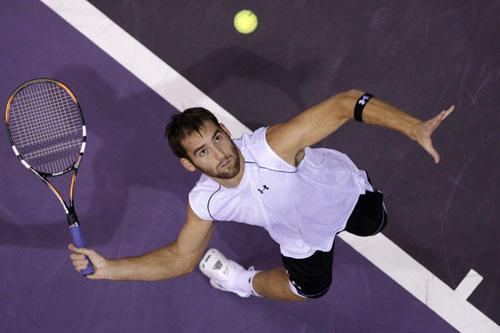 Robby Ginepri of the U.S. serves the ball to Spain's Feliciano Lopez during their tennis match at the Madrid Masters Series tennis tournament October 16, 2006. [Reuters]