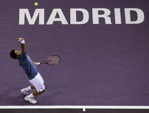 Fernando Verdasco of Spain serves the ball to Britain's Tim Henman during their tennis match at the Madrid Masters Series tennis tournament October 16, 2006. [Reuters]