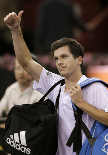 Britain's Tim Henman celebrates his victory over Spain's Fernando Verdasco during their tennis match at the Madrid Masters Series tennis tournament October 16, 2006. [Reuters]