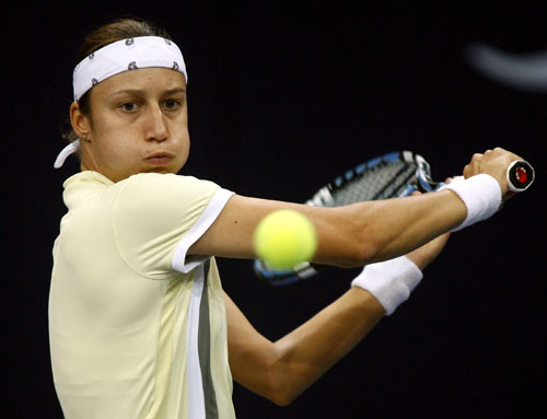 Slovenia's Katarina Srebotnik hits a backhand to France's Mary Pierce during