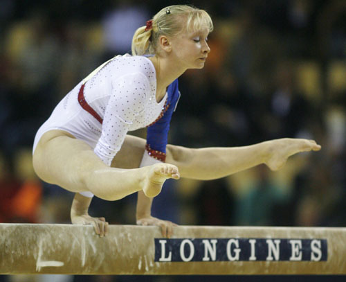 Svetlana Klyukina of Russia competes on the beam during the women's team